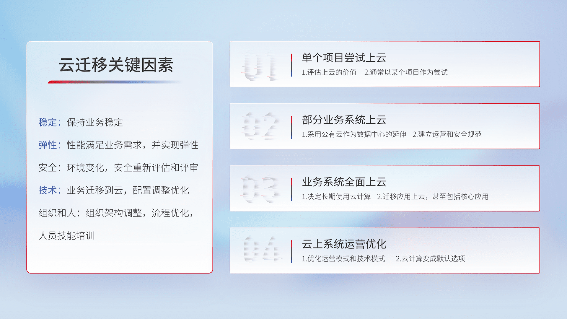 结合实际业务,,,从规划设计、、云平台选型、、、、云原生改造、、、、数据迁移、、、集成交付,,迁移全过程为客户识别最佳上云路径,,,做好风险识别管理,,,设计网络架构、、身份权限、、、、安全审计合规、、操作审计、、、、日志审计、、、、监控告警策略、、、、多站点容灾设计等,,,对云上基础设施进行整体规划,,提升IT治理水平,,以满足弹性、、、、高可用、、、高性能的需求。。。。