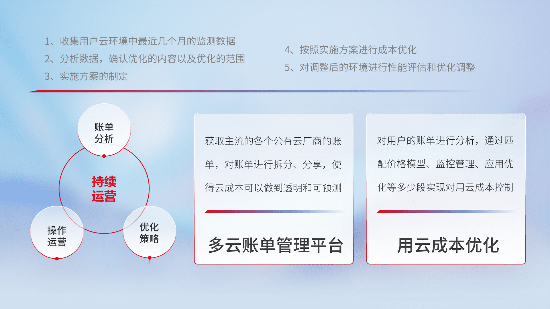 通过多云纳管,,,,以统一的资源数据模型把客户的云资源进行抽象和封装,,,,进而实现对多云资源的统一操作,,,,保障云资源管理的可靠性、、、、稳定性与可用性。。。。量身定制化运维内容,,,,配置、、、开发运维、、、补丁管理、、、、备份、、监控、、、、认证和访问管理、、、审计和日常巡检等,,保障在用云过程中的可靠度,,稳定度以及高可用率。。
